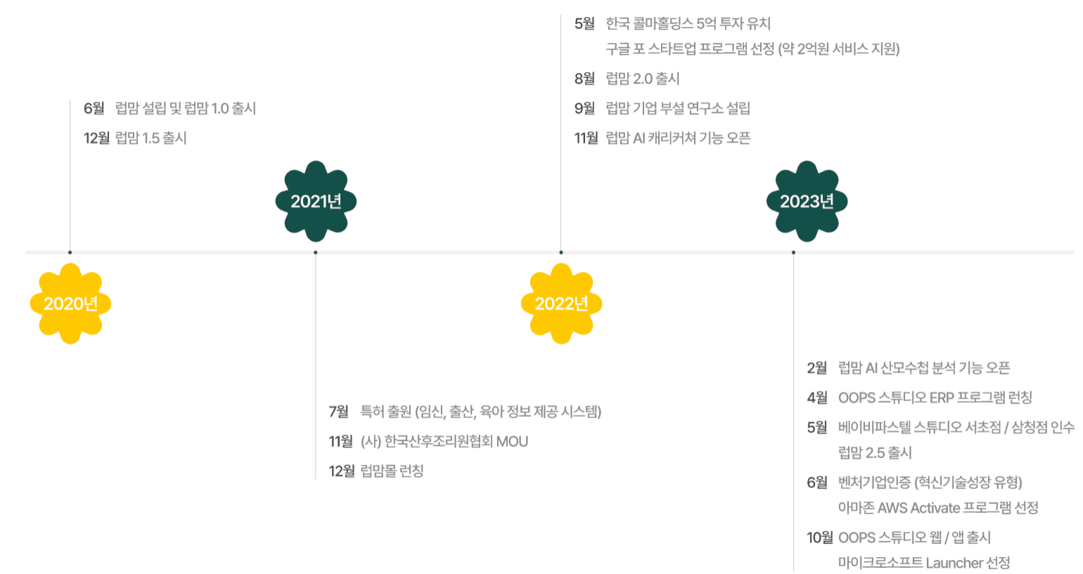 2023년2월럽맘 AI 산모수첩 분석 기능 오픈4월OOPS 스튜디오 ERP 프로그램 런칭5월베이비파스텔 스튜디오 서초점 / 삼청점 인수 럽맘 2.5 출시6월벤처기업인증 (혁신기술성장 유형) 아마존 AWS Activate 프로그램 선정10월OOPS 스튜디오 웹 / 앱 출시 마이크로소프트 Launcher 선정